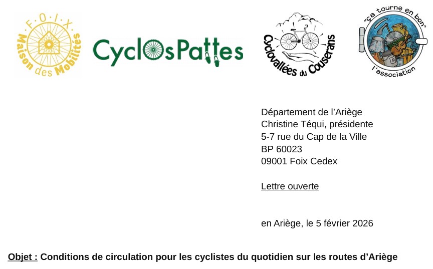 Début février, les quatre associations ariégeoises qui promeuvent la pratique du vélo au quotidien ont adressé une lettre ouverte à… Lire la suite »Quatre associations ariégeoises écrivent au Département