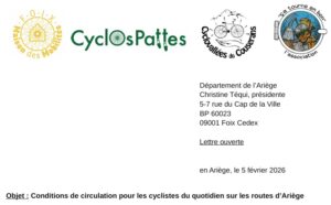 Début février, les quatre associations ariégeoises qui promeuvent la pratique du vélo au quotidien ont adressé une lettre ouverte à la présidente du Conseil départemental. Voici son contenu.