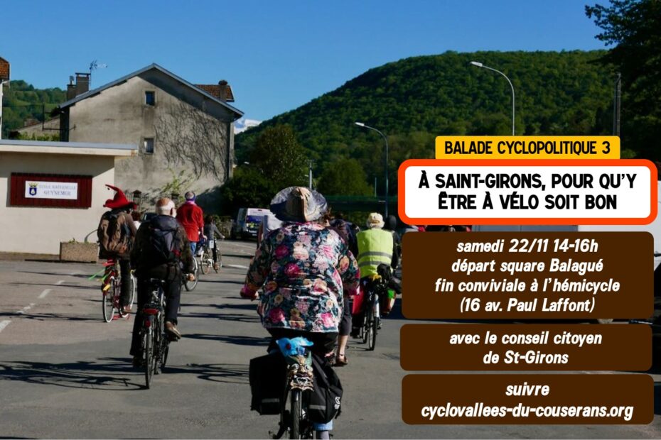 Troisième événement de notre cycle de balades cyclopolitiques : 3 balades cyclopolitiques en amont des élections municipales 2026 Après des… Lire la suite »Balade cyclopolitique n°3 « À Saint-Girons, pour qu’y être à vélo soit bon »